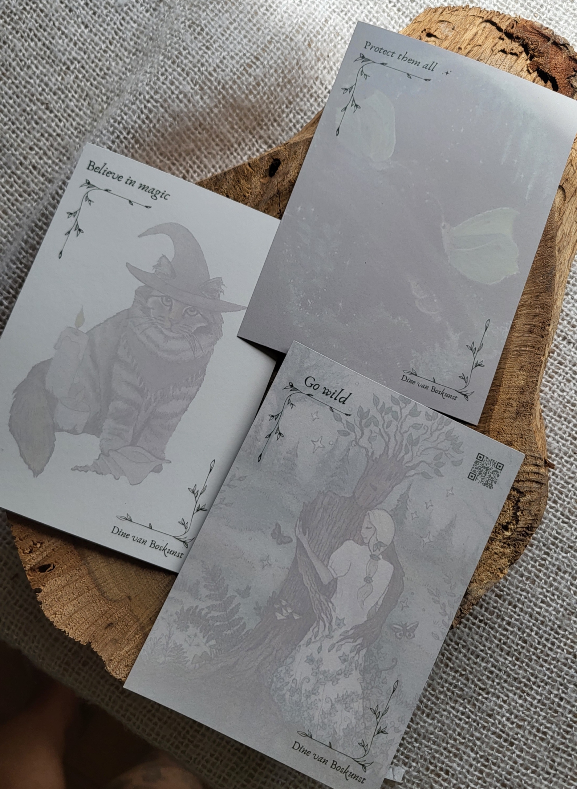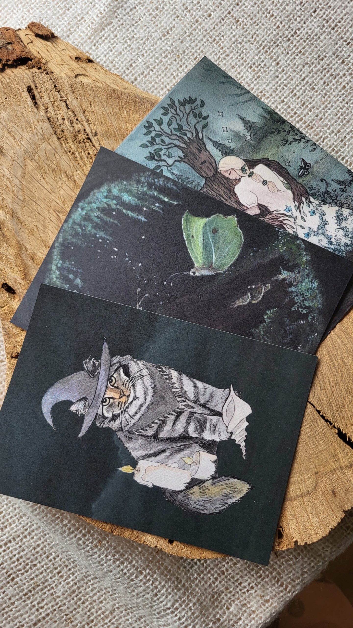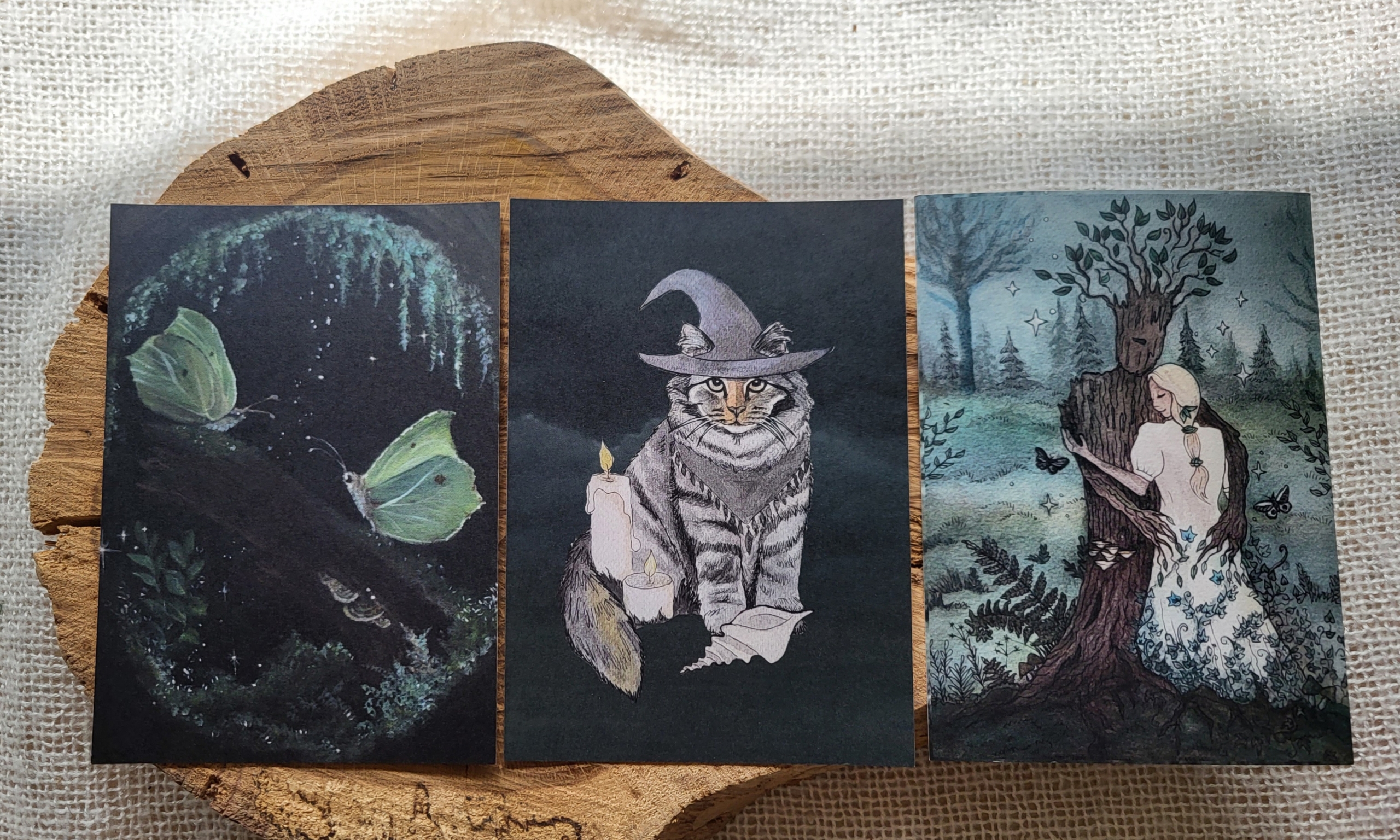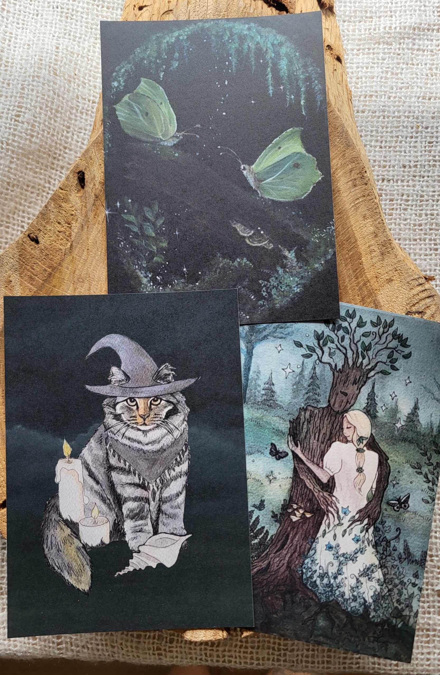 Drie whimsical A6 kaartjes van een heksenkat, boomknuffel en vlindertjes. Je kunt ze gebruiken voor je altaar, opsturen naar iemand of gebruiken als decoratie. Doe ze jezelf of een ander cadeau!