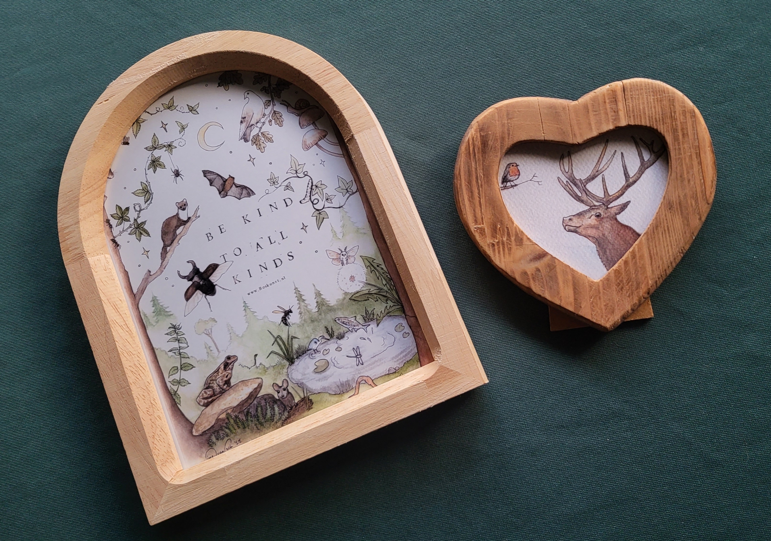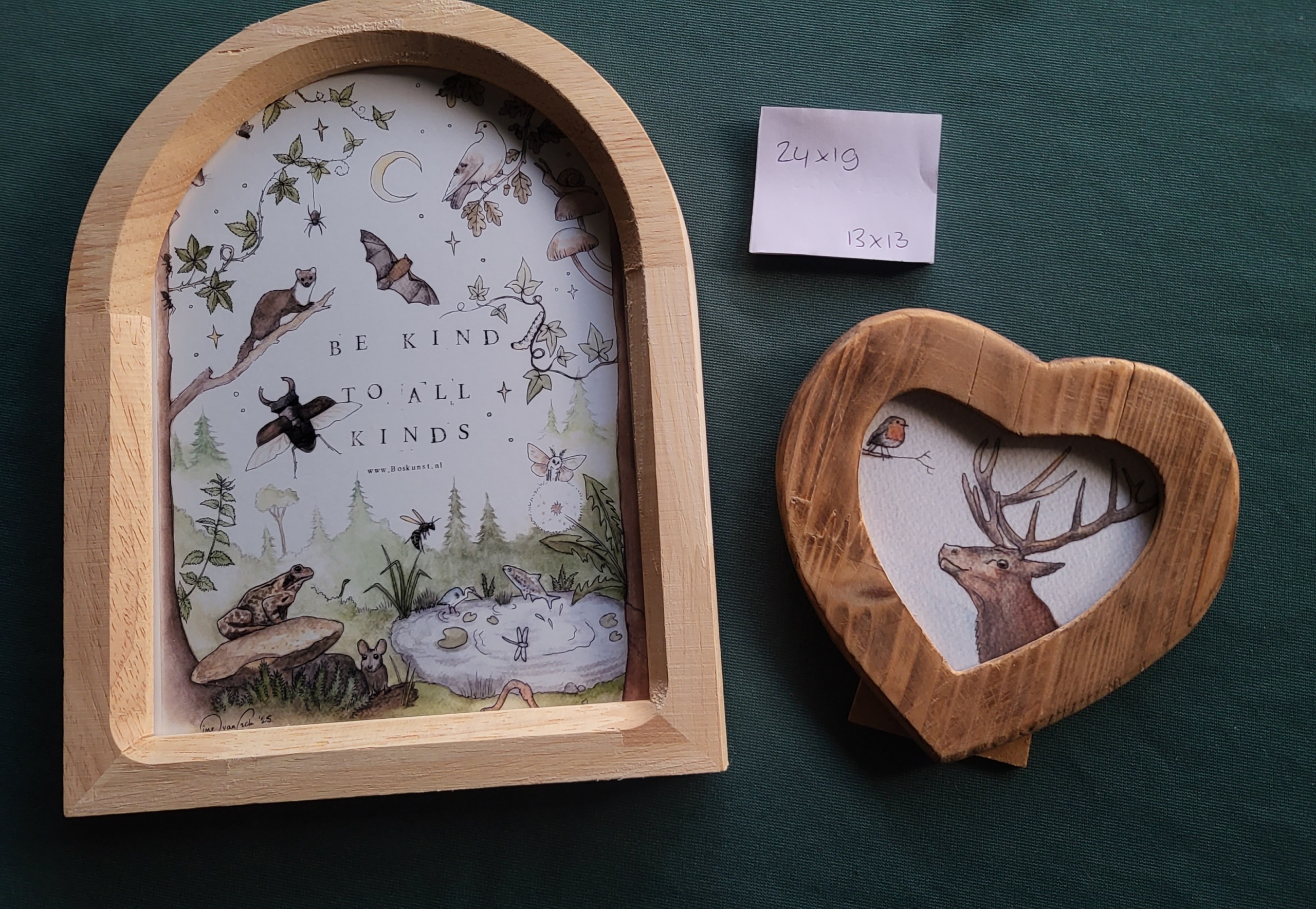 Deze afdrukken zijn van waterverfschilderijtjes en zijn in bijzondere lijstjes ingelijst. Kies je het hert met het roodborstje? Of de halve cirkel met diertjes?